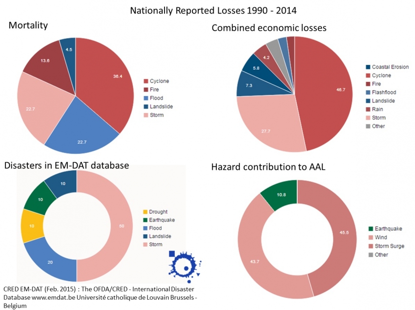 Vulnerability assessments, hazard maps and risk assessments for critical facilities have been prepared for flooding due to storm/wind surge, high wind, drought and debris flow. While maps have been developed, they have not been integrated in the decision support or policy-making process. Presently, NEMO does not support a GIS capability and there is currently no program supporting additional hazard mapping or updates to current hazard maps. Supporting base maps have been prepared in a GIS format and include infrastructure and drainage, national topography, land use, rainfall, soils, geology, etc. These are of varying age, prepared in the 1980s and 1990s, and may not reflect current conditions.
