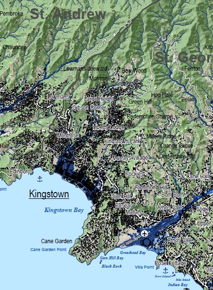 This map was generated using a hillshading map generated from the Digital Elevation Model, which was made from a LiDAR survey. Unfortuantely the original LiDAR data were not available, and the DEM had a missing part in the top of the island, which was subsequently masked using a DEM from SRTM Elevation was also represented in colour, so that the combination of hillshading and elevation gives the best indication of the topography of the country. The available road map was adjusted based on a very high resolution satellite image (Pleiades, with spatial resolution of 2 meters multi spectral and 0.5 meter panchromatic). Screen digitizing was done to map the road and make a road classification. Building information was available for the entire island. Drainage lines were generated from the Digital Elevation Model and through editing. Place names in Grenada were obtained from an existing dataset, and through available maps and Google Earth. Airports, and other landmarks were digitized using the very high resolution images. Quarries were also mapped from these images. The generation of the individual thematic layers was carried out using the ILWIS software. Final map production was carried out using ArcGIS.