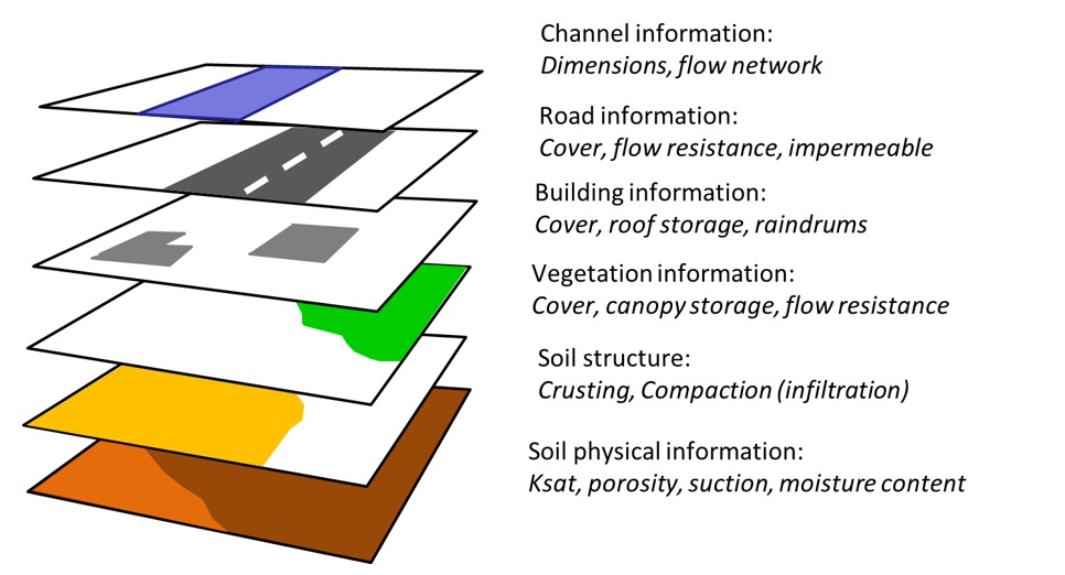 Figure 4. Different information layers are combined into one set of information per gridcell. Vegetation and building information is given as a fraction per cell, roads and channels are given as width in m. The soil layer is the base layer so that we always know what for instance the infiltration beside a road or house is. Infiltration and flow resistance are determined as a gridcell weighted average response.Â