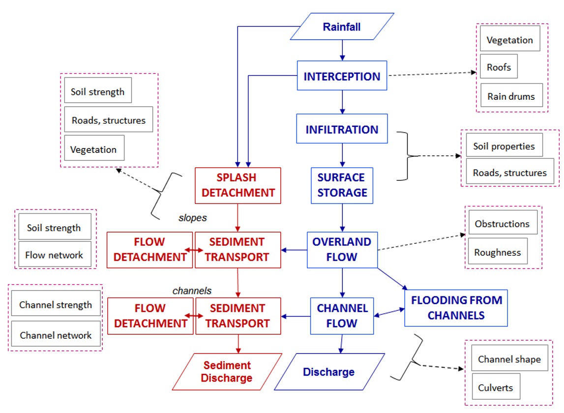 Figure 2. Flowchart of the water and sediment processes in LISEM. In dashed lines the main parameters are given. In CHARIM only the water processes are used (in blue).