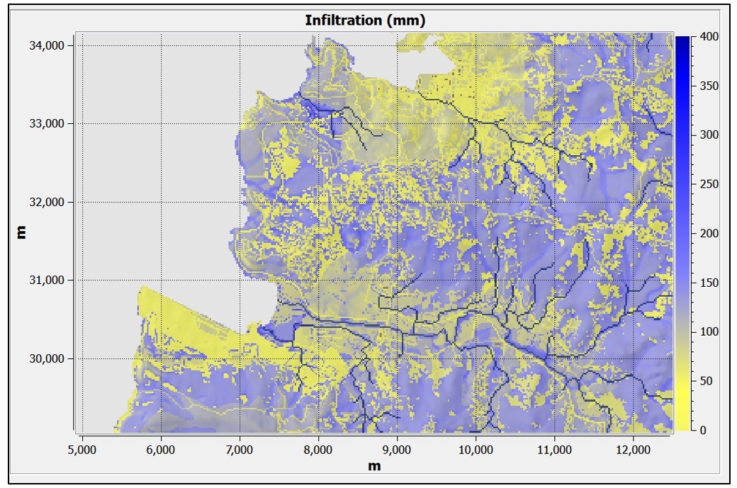 Figure 5. Example of the hydrological response: cumulative infiltration approx. 2 hours after the start of the 1:5 year design rainfall event (legend units are in mm). To the north is Castries, south west is the Oil terminal. Built up area and roads show little infiltration, forested areas have an infiltration above 200mm at this moment. Flooded areas have increased infiltration because of the flood water pressure, in spite of the clay rich soils.