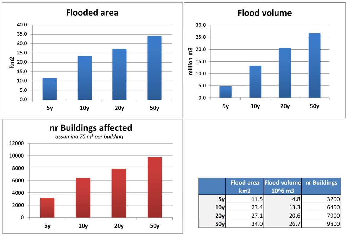 The national hazard maps are based on flood extent only. The extent of the floods is calculated for water depths > 0.05 meter, to avoid excessive areas that are only "wet" but not really pose a hazard. Below a number of locations are highlighted, and compared to known flood areas. Figure 6 shows the summary statistics for the flood hazard for 4 return periods. In total the area flooded increases from 11.5 to 34 km2, while the flood volume increases from 4.8 to 26.7 million m3. Note that for these statistics, areas inundated by less than 10 cm were not flooded. The level of accuracy of the modeling system and the database were not considered sufficient for that level of detail.