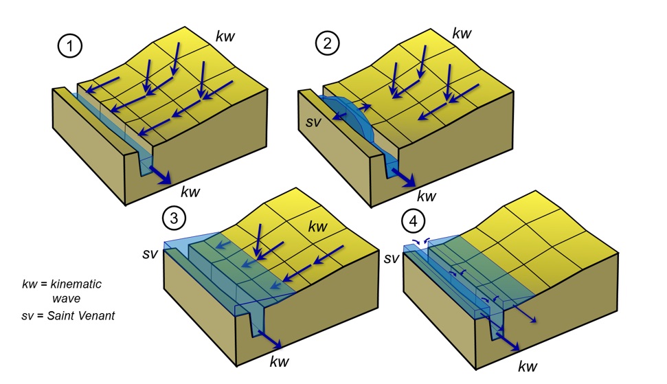 Figure 3. Schematic representation of flow processes from 1D kinematic wave runoff and channel flow (1), to overflow of channels (2), spreading out of water from the channels outward using 2D full Saint-Venant equations (3), and flowing back into the channel when water levels drop, most likely the runoff has stopped by now (4). Runoff continues to flow into the flood zone for a short distance.