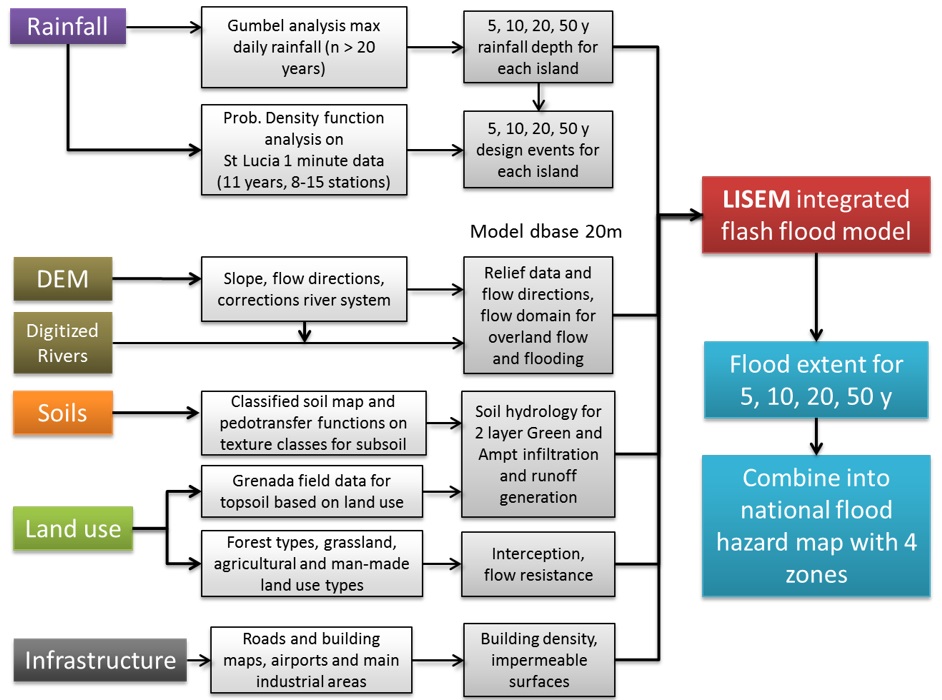 Based on the specific requirements related to the situation in the Caribbean islands we selected the integrated flood model LISEM (freeware and open source developed at the Utrecht University (1992-2006) and subsequently by the ITC (2006-current), in the Netherlands. LISEM is a model that was initially developed to simulate the effect of land use changes at farm level for sustainable land management, to combat erosion and desertification. Recently a 2D flood module was added to enable integrated flood management. It is an spatial event based model that operates at timescale of < 1 minute and spatial resolutions of < 100m grid cells. It does not model groundwater and evapotranspiration because ift focusses on the consequences of single rainfall events.