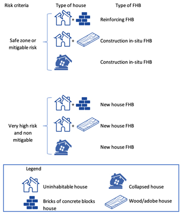 According to the classification of the houses, the Ministry of Housing has established three types of family housing bonds (FHB): reinforcing, construction in-situ and purchase of new house (relocation or resettlement). These bonds are assigned as a function of the level of damage, risk and material of the affected house according to the criteria shown in Figure 2