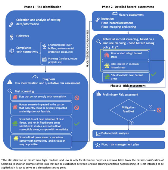 - Preliminary risk assessment: based on hazard and vulnerability information, a preliminary analysis on the feasibility of flood management measures to reach an acceptable risk level is carried out.