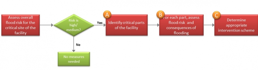 Analysis steps: A- Identify the critical Part of the facilities based on the functioning, contents, building type, and its role in the overall infrastructure. B- Determine the risk of flooding as well as the consequences of flooding to the operation of the facility, safety of its occupants and possible impact on the environment of the area as consequences of flooding. Consider the elevation, location, building characteristics and other vulnerability factors during this assessment. C- Determine the suitablility of protection measures which may include individual or combination of the following: