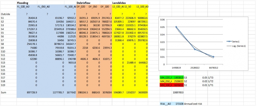 - For each land parcel it will calculate the maximum loss for the same return period resulting either from flooding, landslides or debrisflows, as these events are caused by the same trigger.